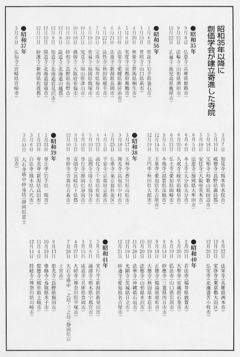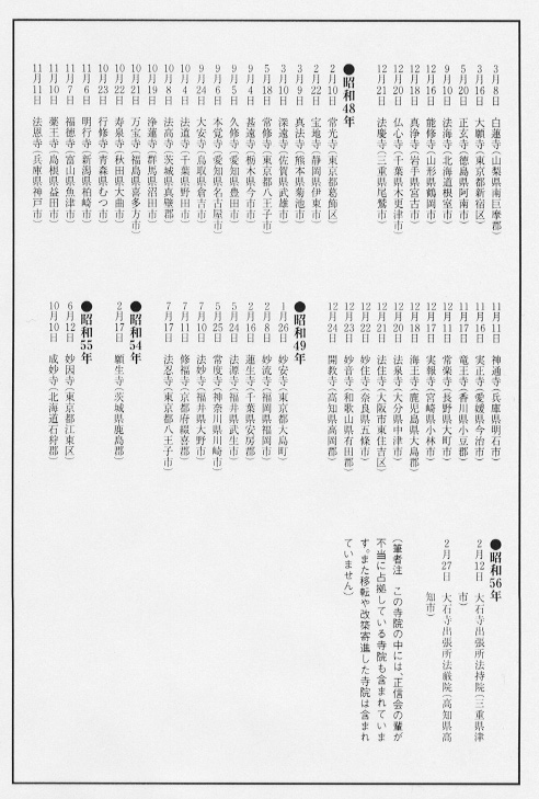 池田名誉会長が昭和三十五年五月三日に創価学会会長に就任してより、昭和五十八年十二月末日までに創価学会が日蓮正宗に寄進した寺院の一覧を掲載した。別ページ に掲載した、昭和五十九年三月三十一日より今日に至るまでの百十一カ寺の寄進寺院一覧表とあわせて見ていただきたい。